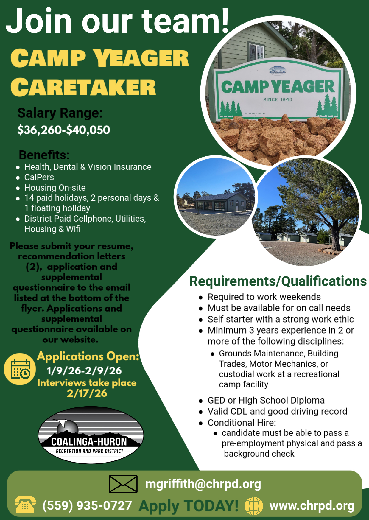 Coalinga-Huron Recreation and Park District is looking for a Camp Caretaker.